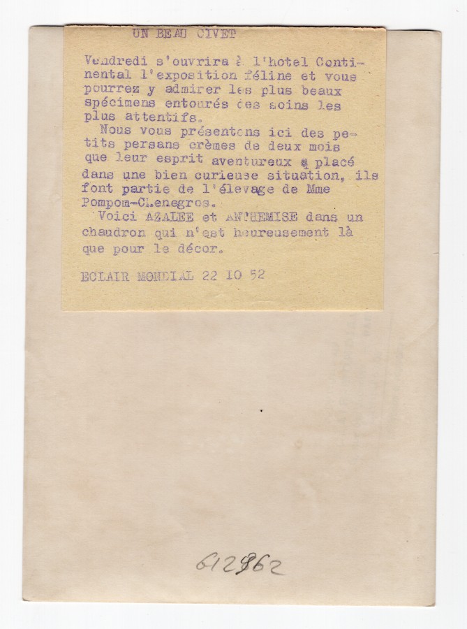 Vintage Press Studio Photo, text attached on reverse: ' Un beau civet, Vendredi s'ouvrira à l'Hôtel Continental l'exposition féline et vous pourrez y admirer...................'