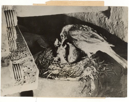 Vintage Press Studio Photo. Text glued on reverse: Cette maman rouge gorge, qui a construit son nid sur l'attelage d'un wagon restaurant à Tacoma, dans l'etat de Milwaukee, a failli priver les voyageurs de leurs repas: en effet, le chef de gare a interdit qu'on ne déplace le wagon avant que la petite famille n'ait déménagé..