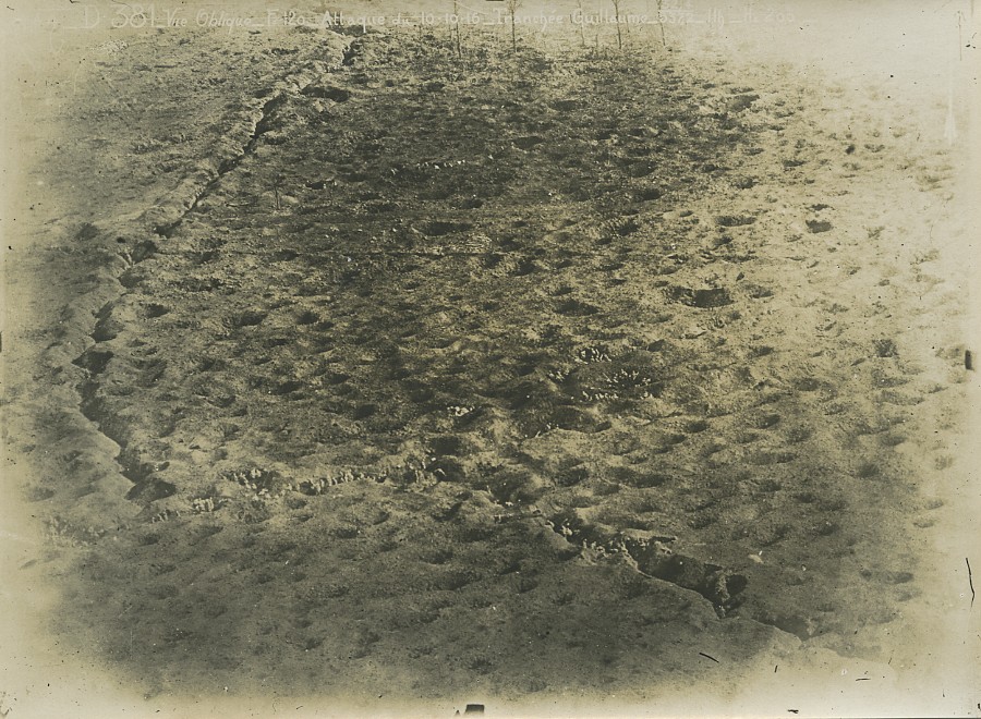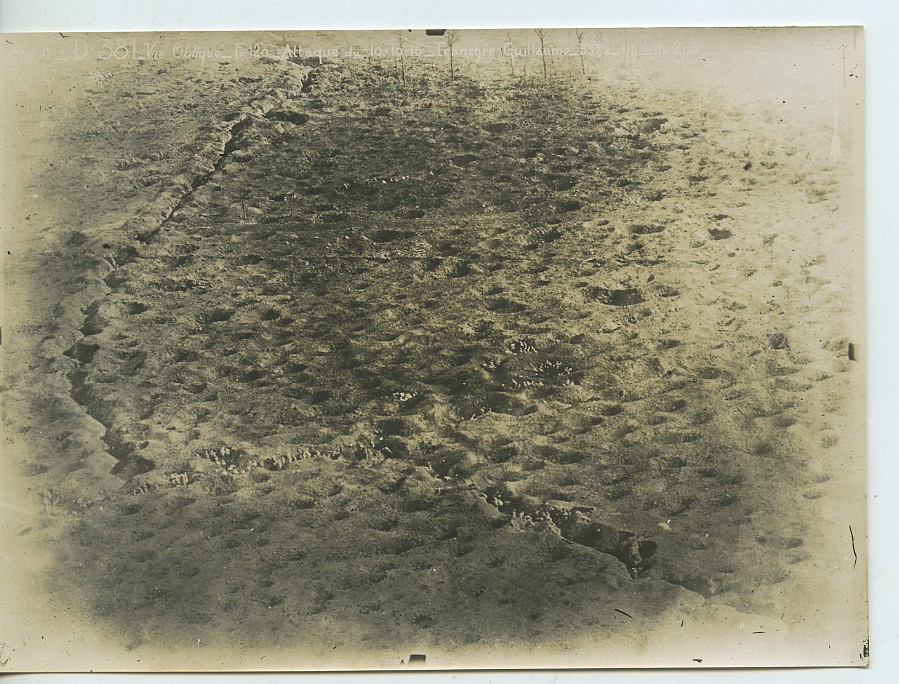 Vintage aerial Military studio Photo. Titled in the negative: D381 Vue oblique. F.120. Attaque du 10.10.16 Tranchee Guillaume 5372 (?) 11h H 200m