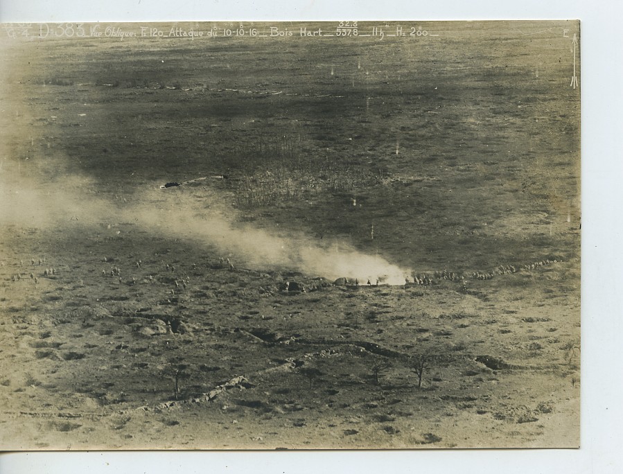 Vintage aerial Military studio Photo. Titled in the negative: G-4 D383 Vue oblique. F120. Attaque du 10.10.16 Bois Hart 32.2/537.8 11h H 200