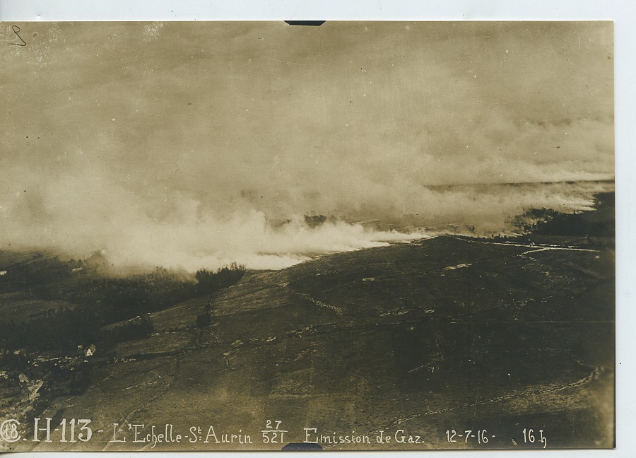 Vintage aerial Military studio Photo. Titled in the negative: C18 H-113 L'Echelle-Saint-Aurin 27/521 Emission de Gaz 12.7.16 16h