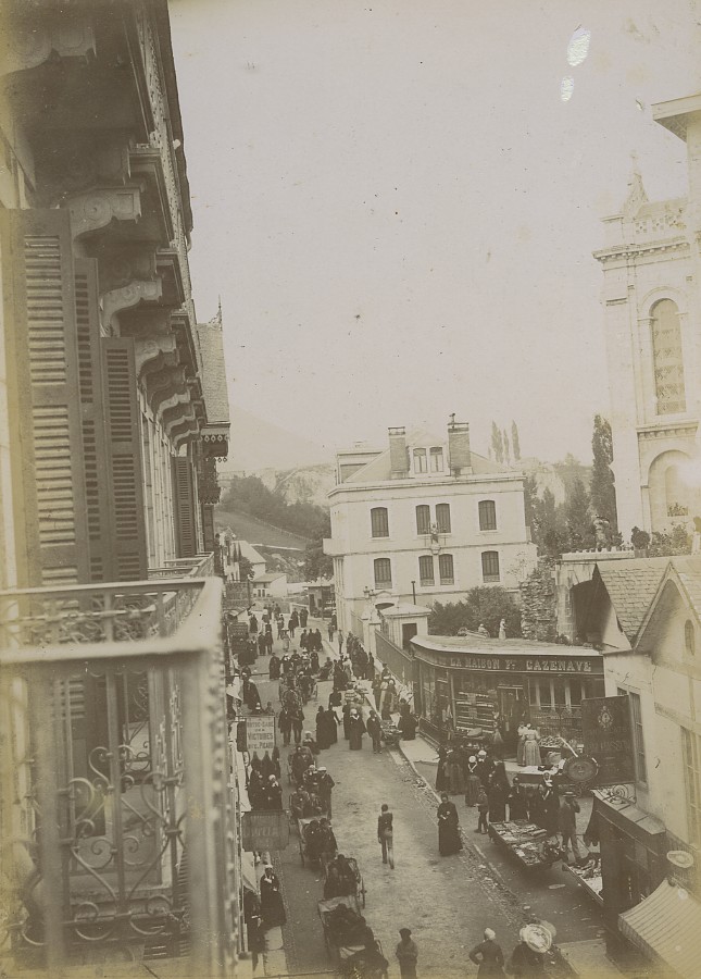 France Lourdes rue animée Magasins Maison Cazenave et le Gave 2 anciennes Photos 1900