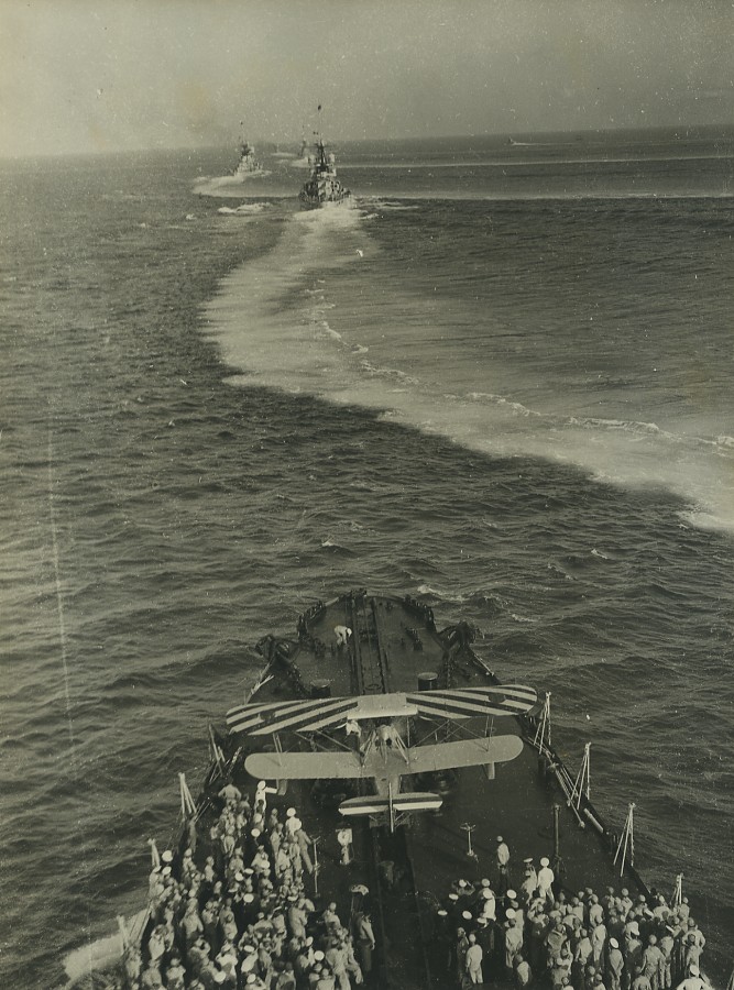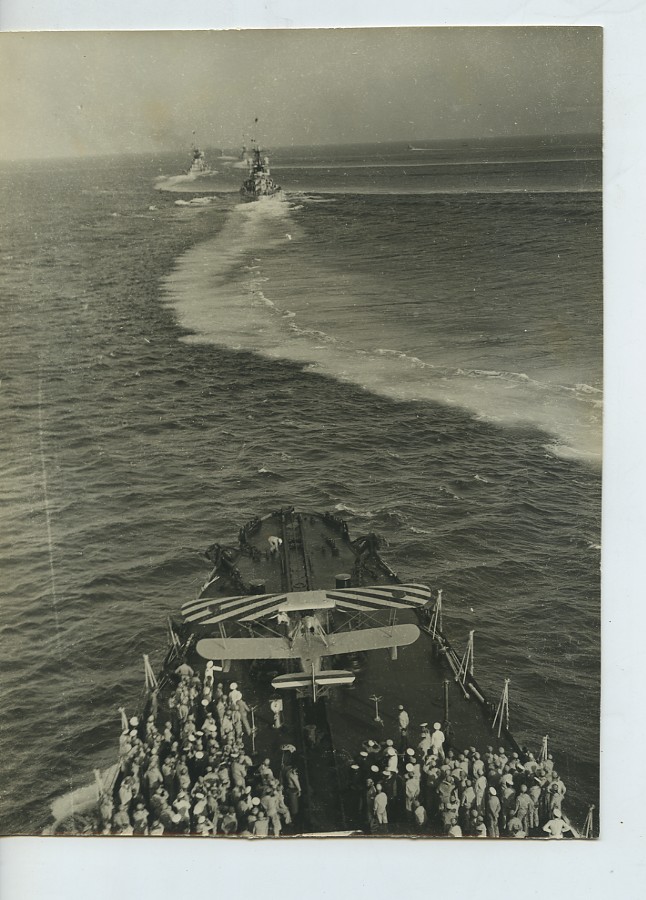 Italy Marine Militaire Manoeuvres Navales Hydravion Catapulte Cuirasse Roma? Ancienne Photo 1934