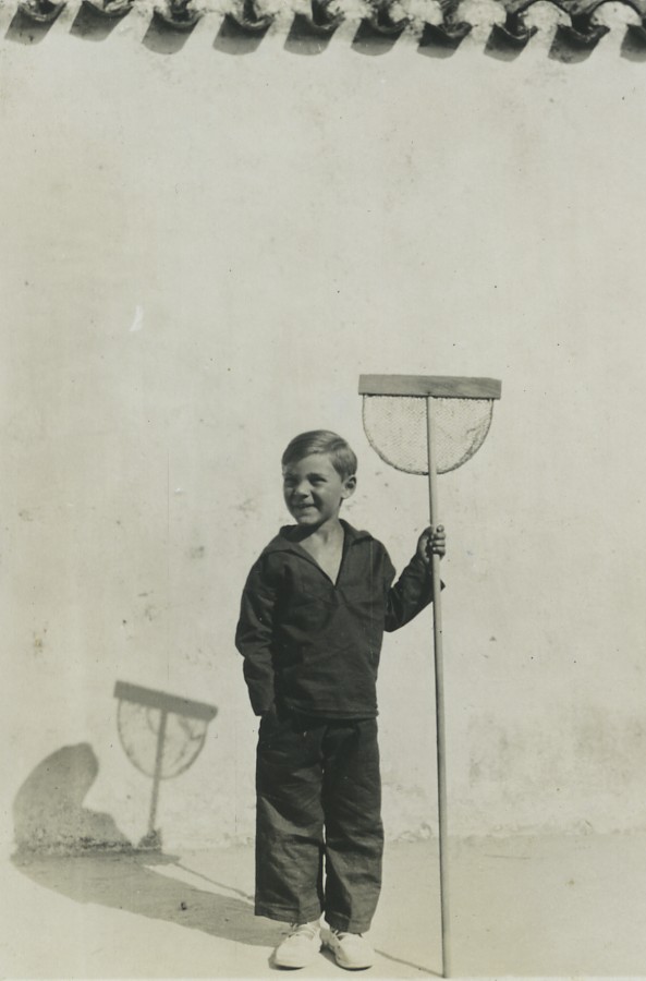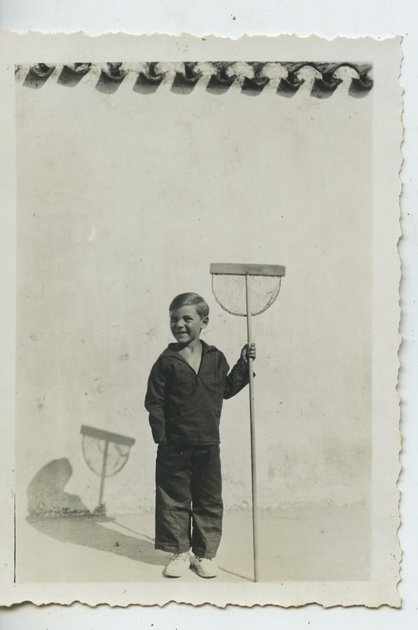 France Seaside Boy with Shrimp Fishing dip net Shadow Old snapshot Photo 1950