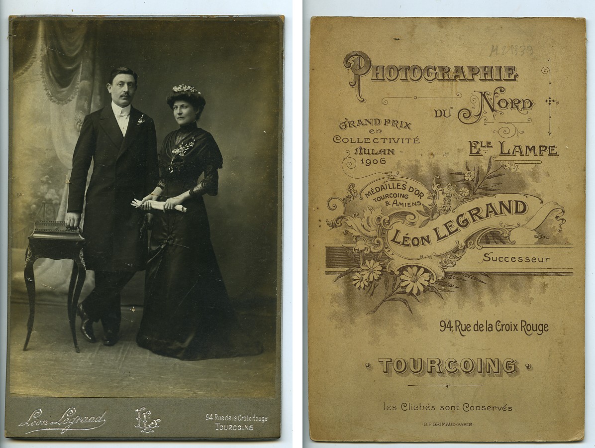 France Tourcoing Couple Portrait Wedding Old Cabinet Card Photo Legrand 1900's