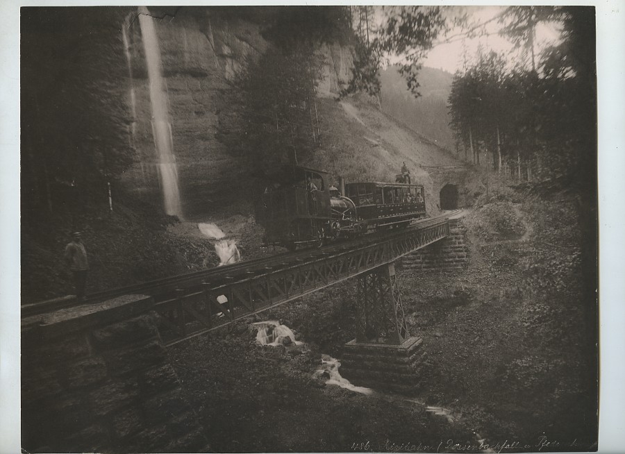 Switzerland Rigi Railway Train on bridge Waterfall Old Photo Schroeder 1890