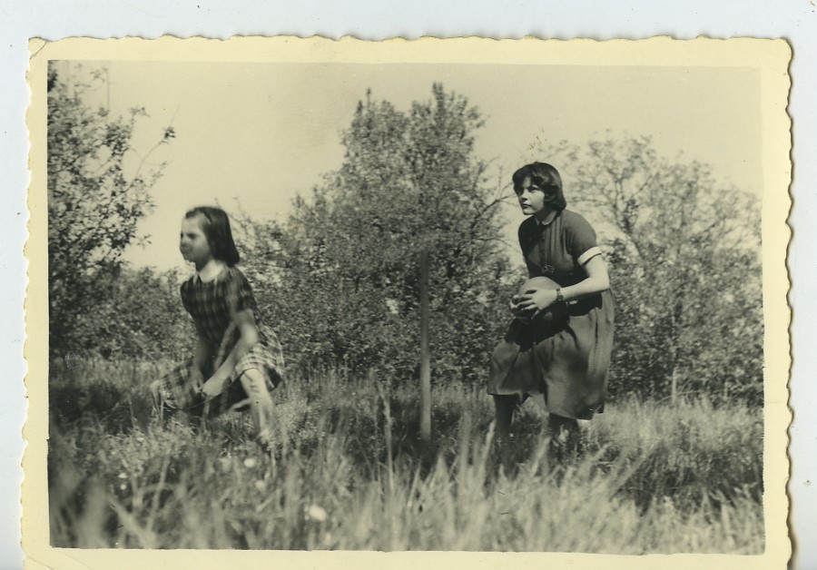 France Girls Playing Ball Game in Orchard? Old snapshot Photo 1950