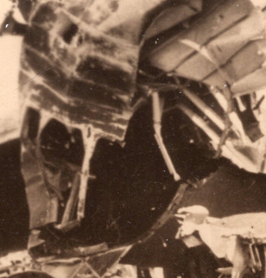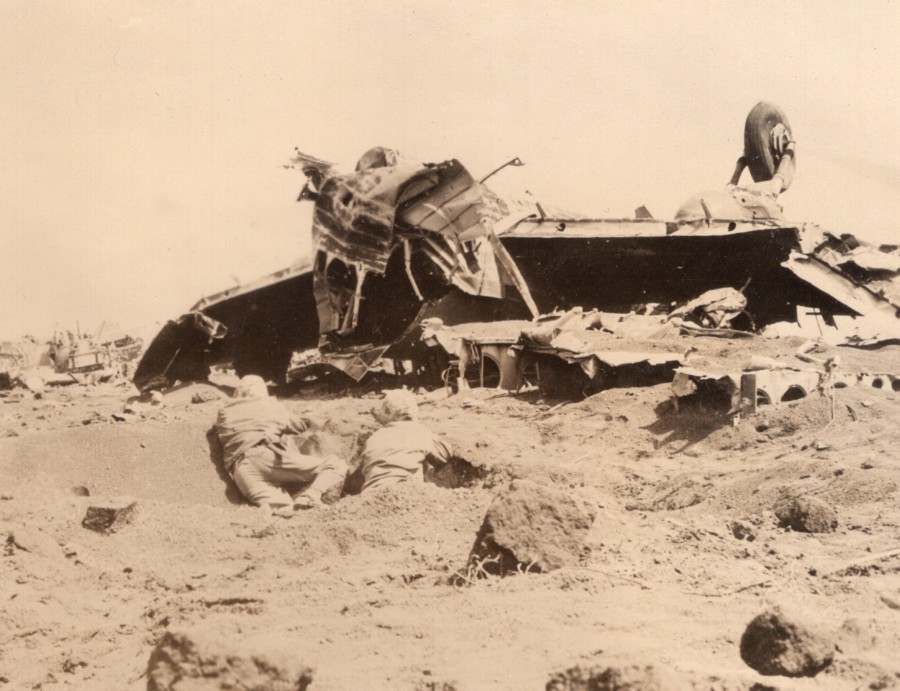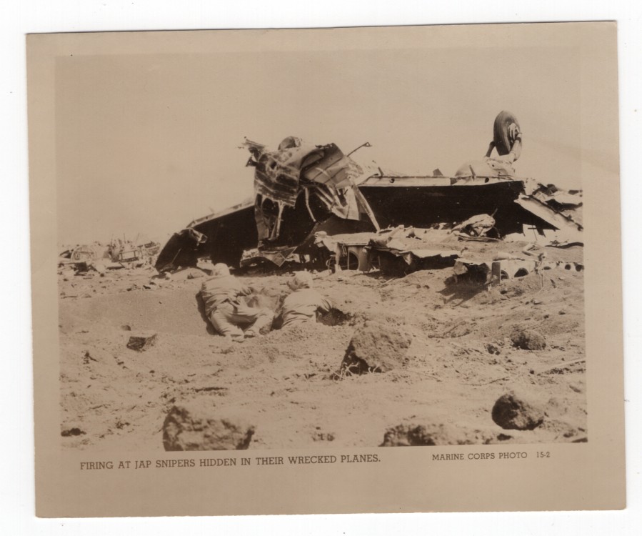 WWII Marine Corps Firing at Japs Snipers in Wrecked Plane Japan Old Photo 1945