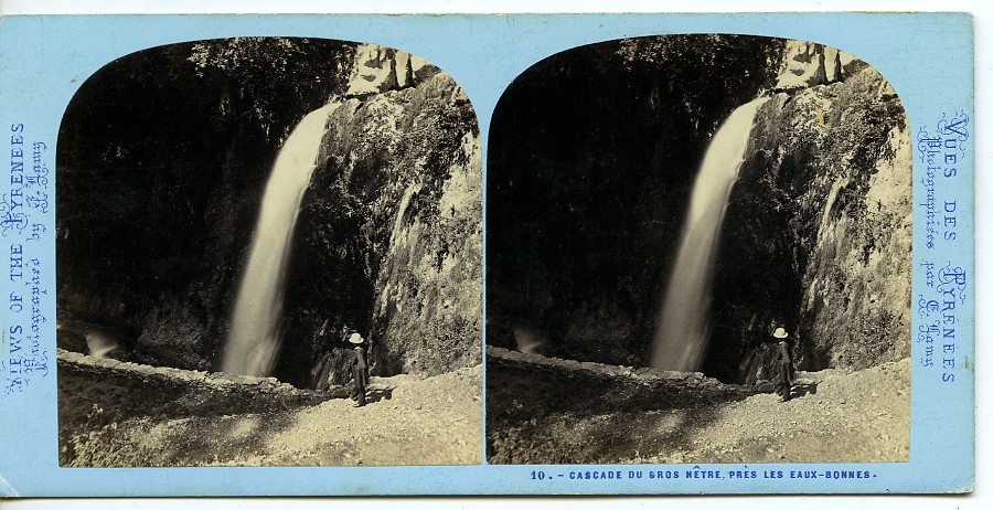 Pyrenees Cascade du Gros Hêtre Waterfall Eaux Bonnes old Stereo photo Lamy 1867