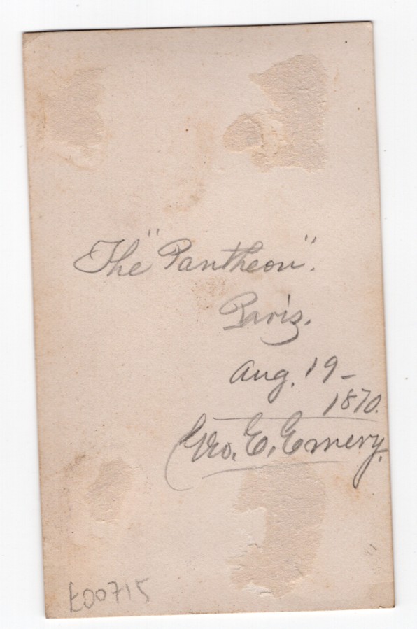 Pencilled on reverse by original owner: The Pantheon, Paris Aug. 19, 1870 (Geo. E. Emery).
