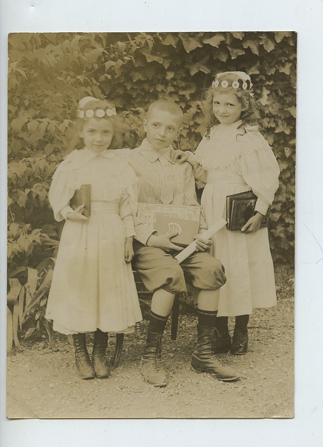 France School Children posing 2 Girls and a Boy Old Photo 1907